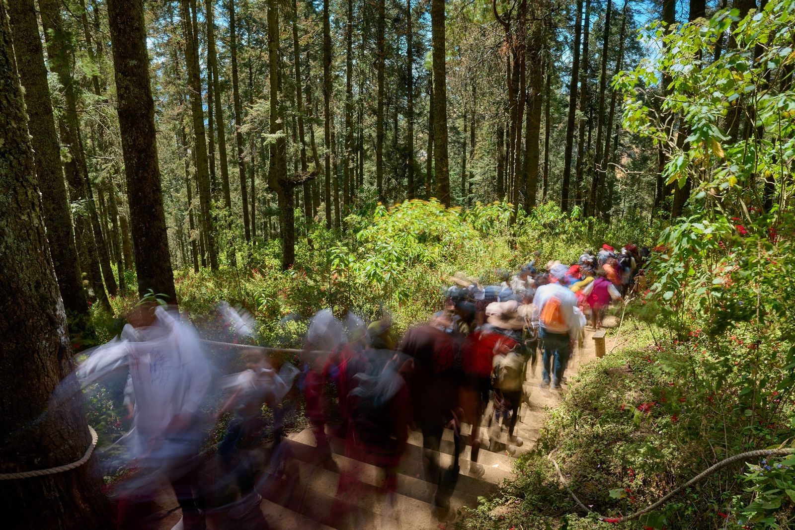 Los turistas del Santuario de El Rosario, en México, recorren el parque por un sendero designado. Además de recoger la basura y los residuos, viajar dentro de los límites de los visitantes garantiza que no se dejarán rastros nocivos.