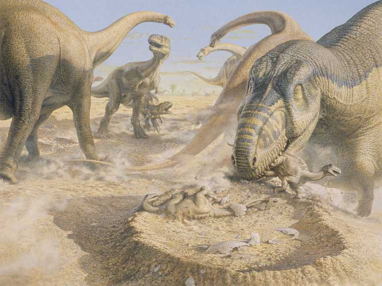 El Patagotitan mayorum fue reconocido como el dinosaurio más grande del mundo, desplazando al famoso Tiranosaurio rex. En esta imagen, especies de Aucasaurus atacan a los bebés titanosaurios recién nacidos.