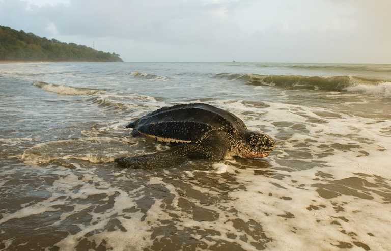 Solo una de cada mil tortugas laúd sobrevive hasta la madurez sexual y regresa al lugar de su nacimiento para poner sus huevos, como ocurre con la hembra anidadora de esta imagen en Matura (Trinidad). Los programas de conservación de tortugas invitan a los turistas a involucrarse en Trinidad y Tobago.