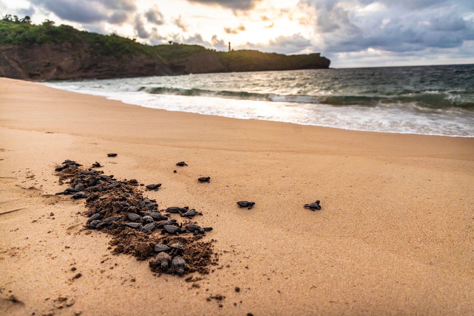 Tras pocos días de haber eclosionado en el campamento tortuguero de playa Teopa, un grupo de tortugas intenta llegar al mar en Careyes, Jalisco.