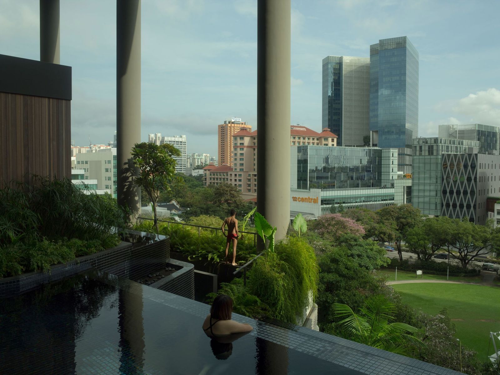 En Singapur, la vegetación cae en cascada desde un hotel de lujo, calmando a los huéspedes en la piscina del balcón y a la gente en la calle de abajo.