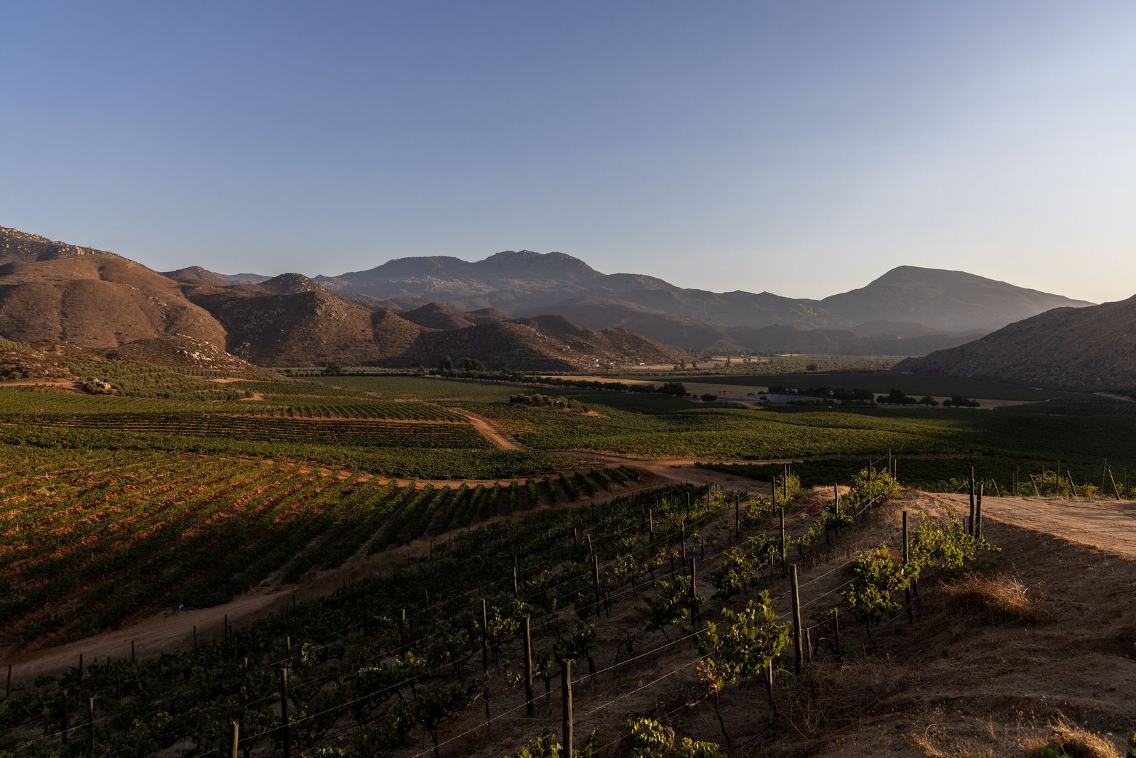 Panorámica del rancho Viña Alegre de la bodega L.A. Cetto en Valle de Guadalupe. Alrededor de las 6 de la tarde, la paleta de colores se torna de cálida a tonos violáceos.