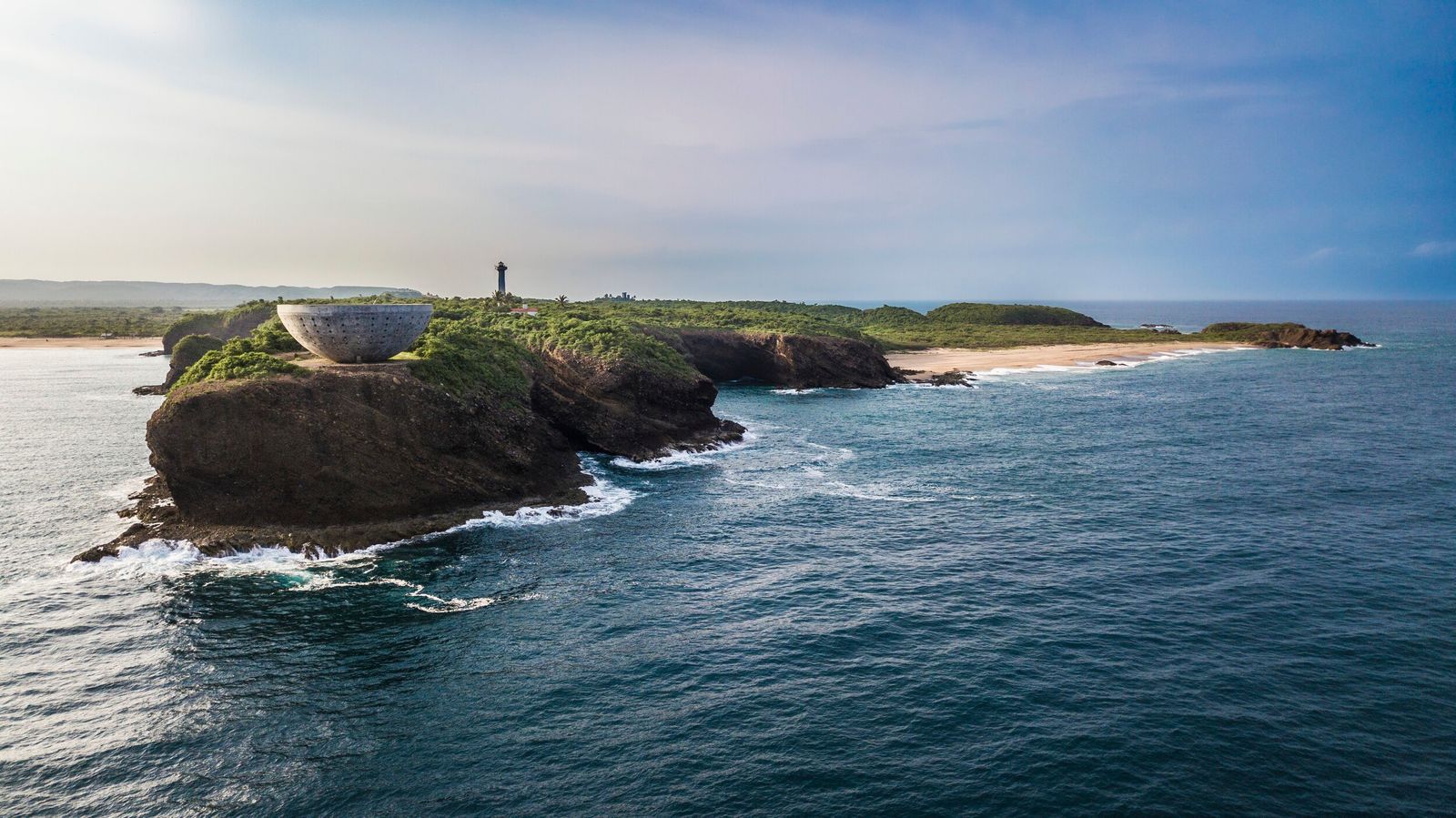 Una vista aérea de la Copa del Sol, una escultura monumental en forma de hemisferio frente al Pacífico en Careyes, Jalisco.